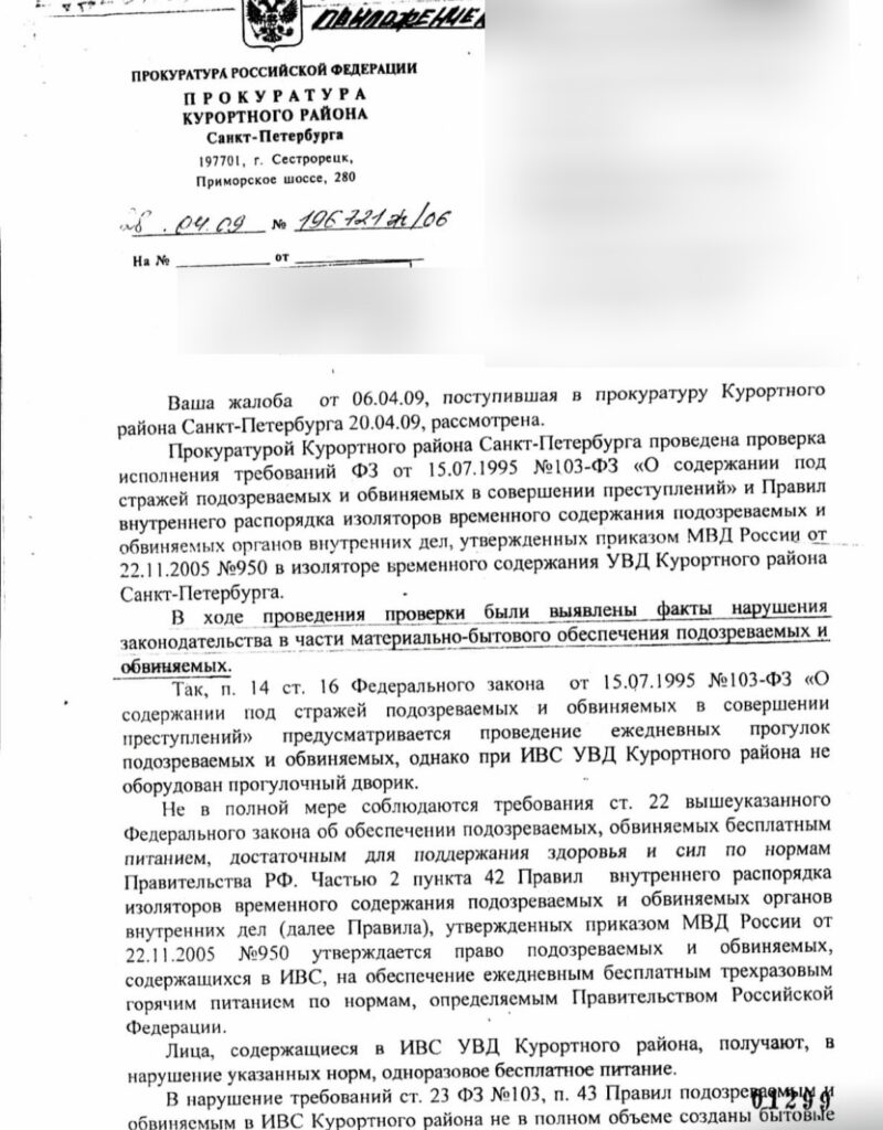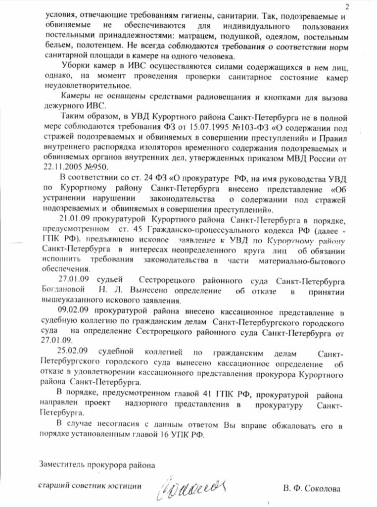 По нашим обращениям была проведена проверка и указанные доводы о нарушениях прав неопределенного круга лиц, содержащихся в ИВС Курортного района г. Санкт-Петербурга, подтвердились.